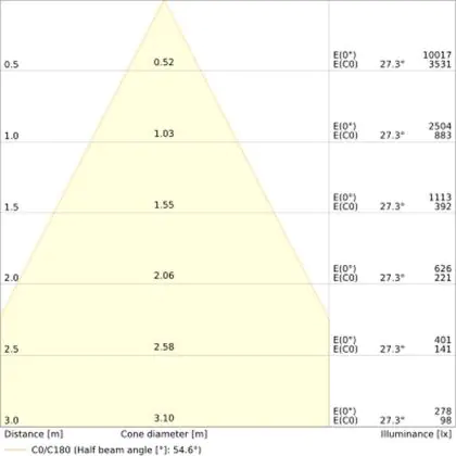 Der Abstrahlwinkel bezeichnet den Winkel, in dem das Licht aus der Lichtquelle ausgestrahlt wird. Er wird in Grad (D) angegeben. Je geringer die Gradzahl des Abstrahlwinkels ist, desto kleiner ist auch der Durchmesser des Lichtkegels, den die Lichtquelle produziert. Beispiel: Wird eine Lampe mit einem Abstrahlwinkel von 60 Grad an der Decke (2,5 m Höhe) angebracht, erzeugt sie einen Lichtkegel von 2,9 Metern Durchmesser. Hat die Lampe hingegen einen Abstrahlwinkel von 120 Grad, beträgt der Lichtkegel 8,7 Meter im Durchmesser. |
